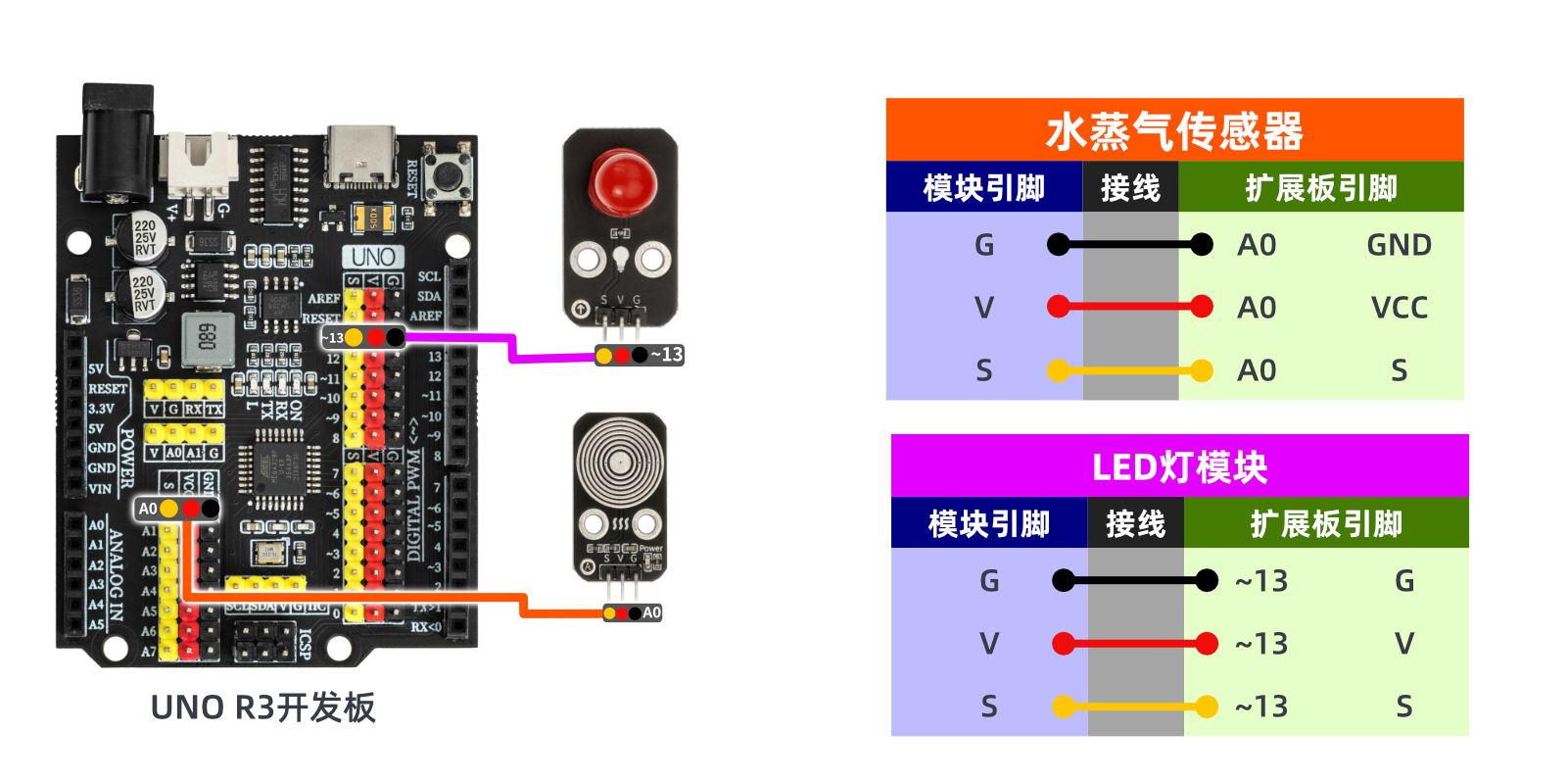 //led灯模块uno开发板接D13引脚;水蒸气传感器接uno开发板A0引脚