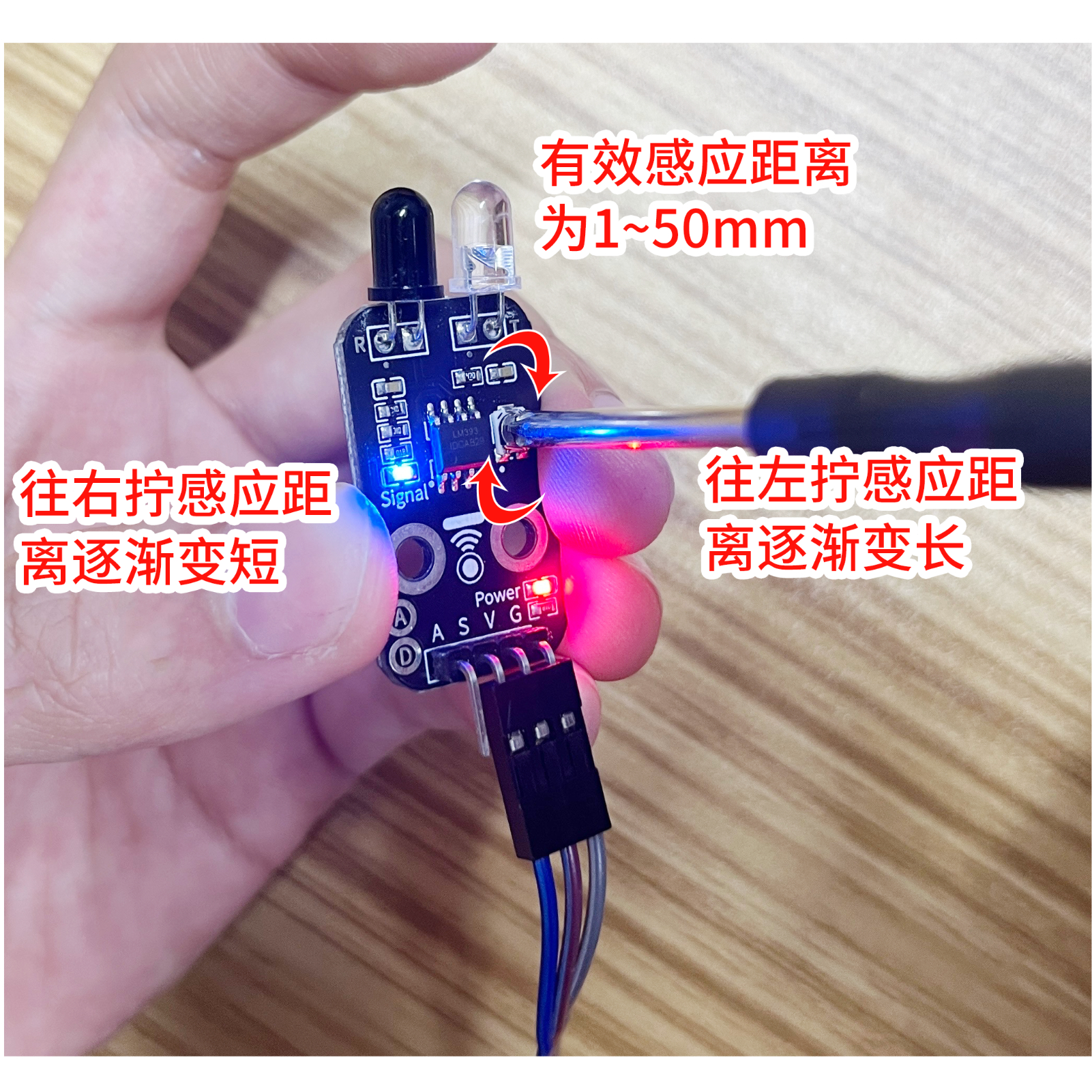인프라레드 방해 방지 모듈이 전원을 켜져 있는 상태에서, 작은 둥지칠로 인프라레드 방해 방지 모듈의 항구를 조절하여 손가락이 인프라레드 방해 방지探头에서 약 20mm 정도 떨어져 있도록 합니다. 센서 신호가 파란 불이 켜지고, 손가락이探头에서 20mm 이상 떨어져 있을 때 인프라레드 방해 방지 모듈 신호가 파란 불을 꺼집니다.주의: 적외선 피드백 모듈의 적외선 발사 및 수신探头는 환경 빛에 대한 방해가 크므로, 강한 햇빛 아래에서 테스트하지 마세요.
