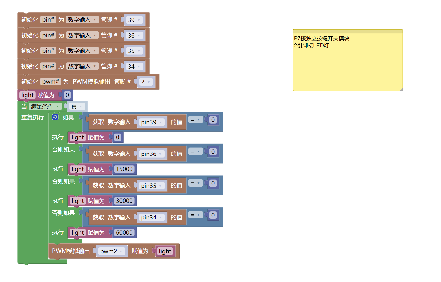 pwm2.duty_u16(light)7、미스키 Mixly 예제 프로그램(그래픽 언어)