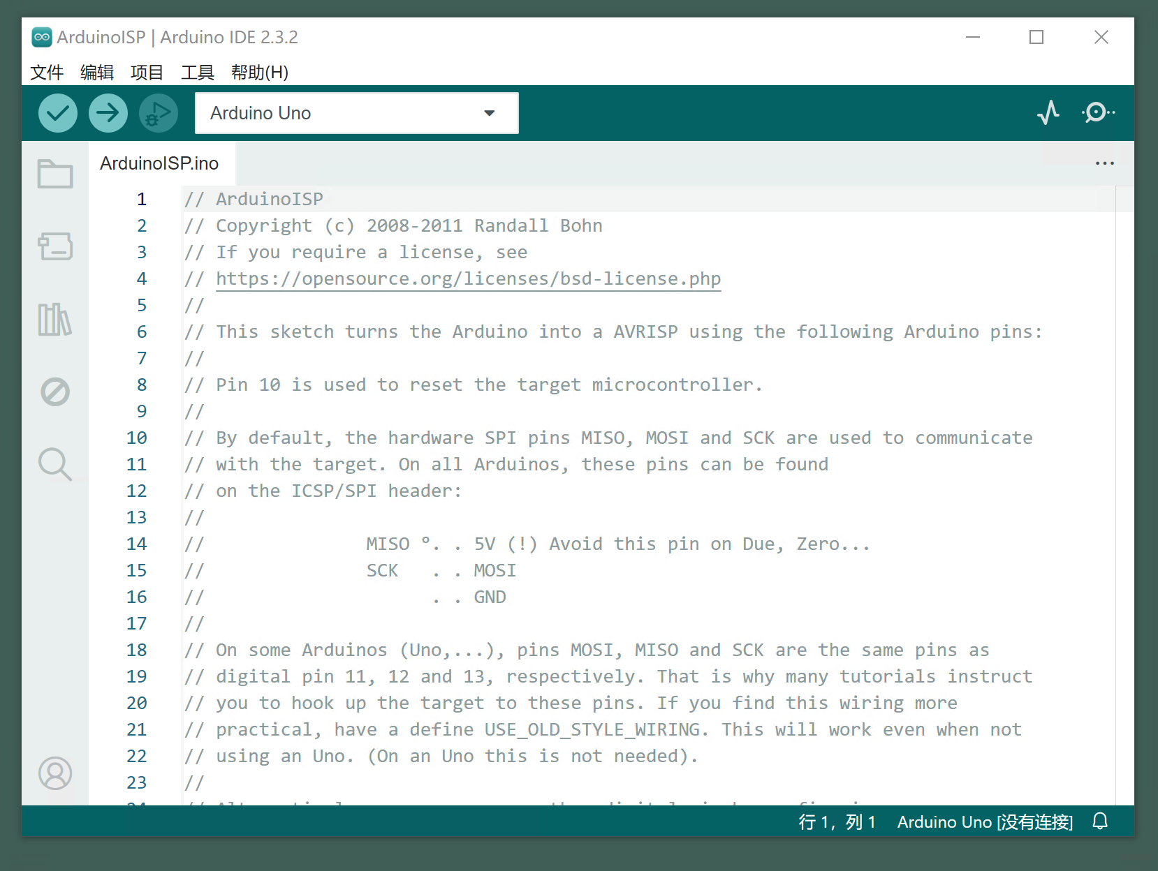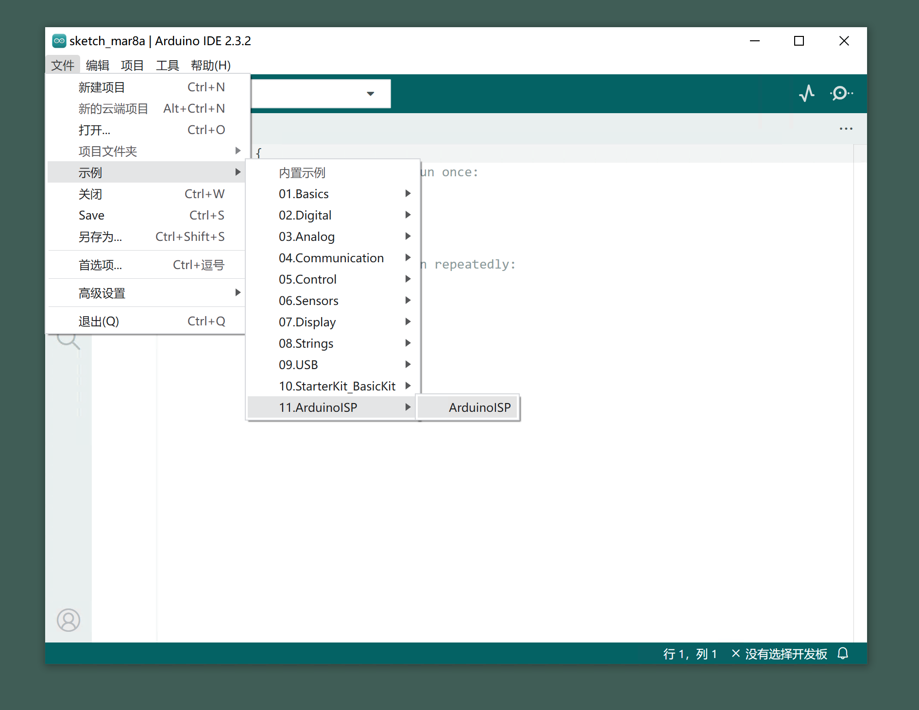 메뉴 바에서 파일을 찾아서 -> 예제 -> 11.ArduinoISP -> ArduinoISP을 열기