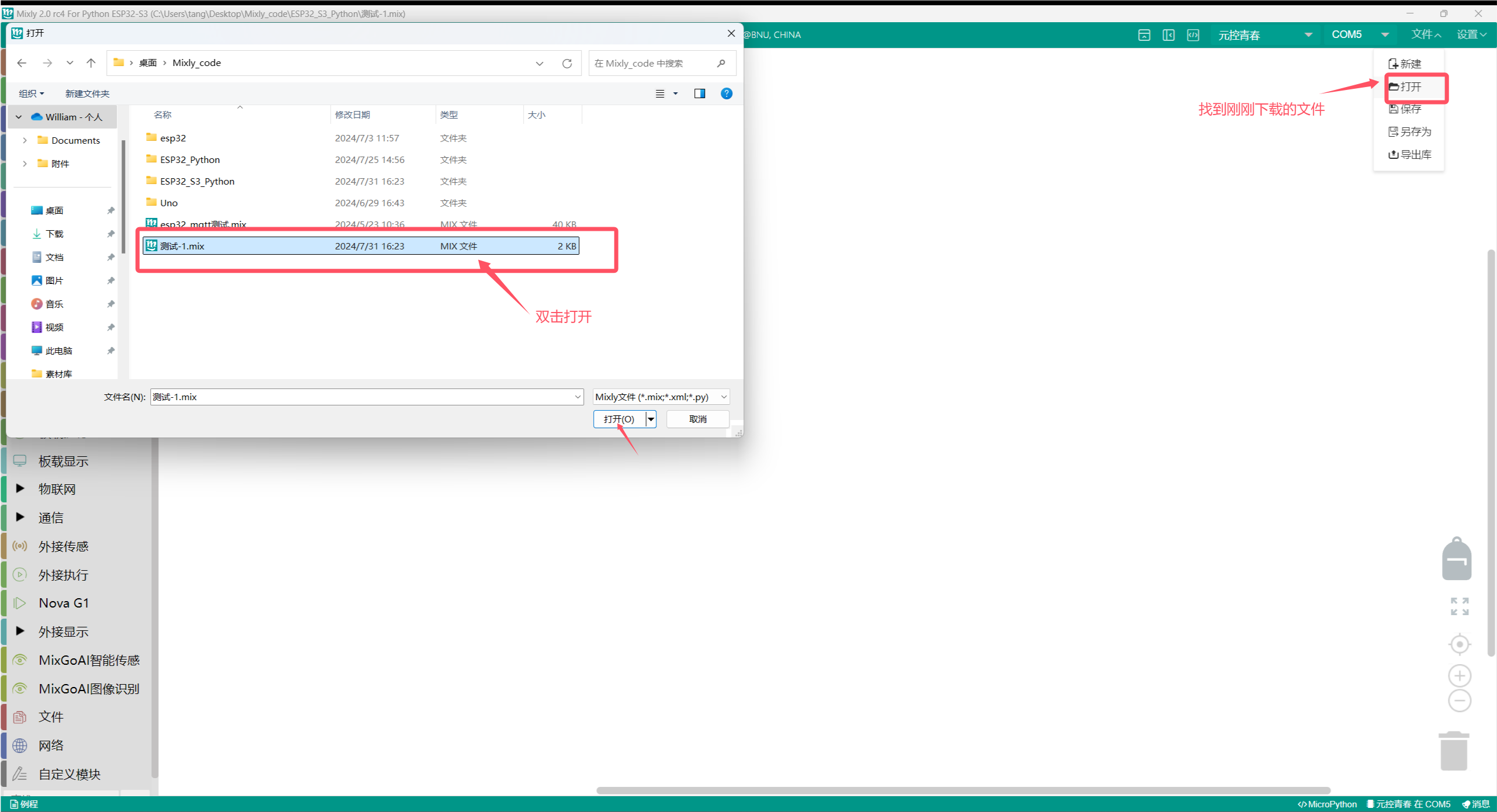 컴퓨터 데스크톱에서 mixly 아이콘을 클릭하여 소프트웨어를 엽니다. Python ESP32-S3를 선택하세요