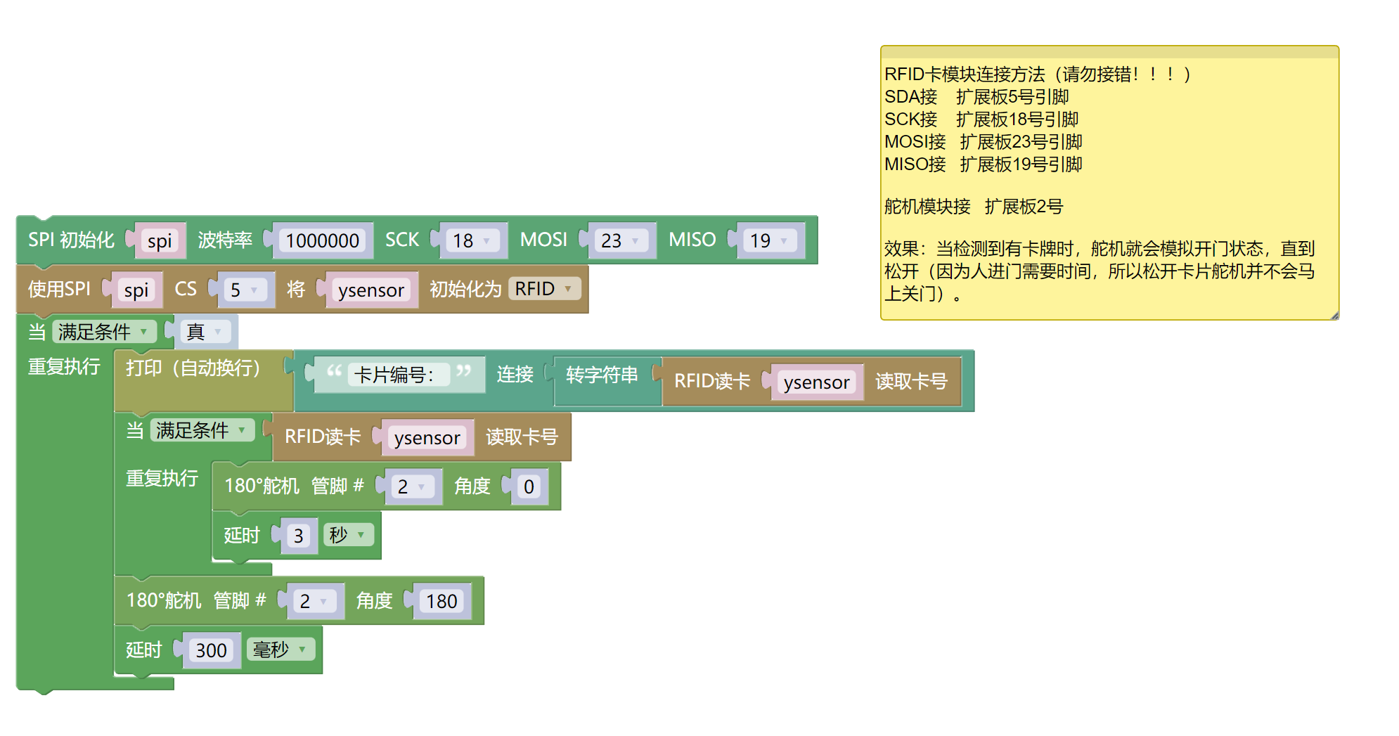 선을 연결한 장치를 이어서, 위의 프로그램을 Arduino UNO 개발 보드에 프로그램을 기록한 후, 카드를 스캔하면 서보 모터가 문을 열고 닫는 모션을 시뮬레이션합니다。
