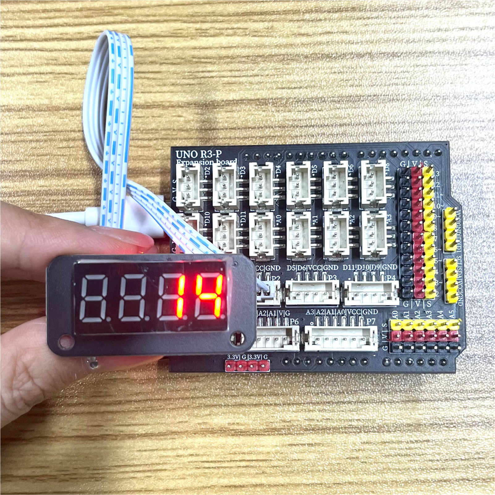 선을 연결한 후, 이 프로그램을 Arduino UNO 개발판에 프로그래밍한 후, LED 디지털管이 1초마다 숫자를 자동으로 +1 보여줄 것입니다。