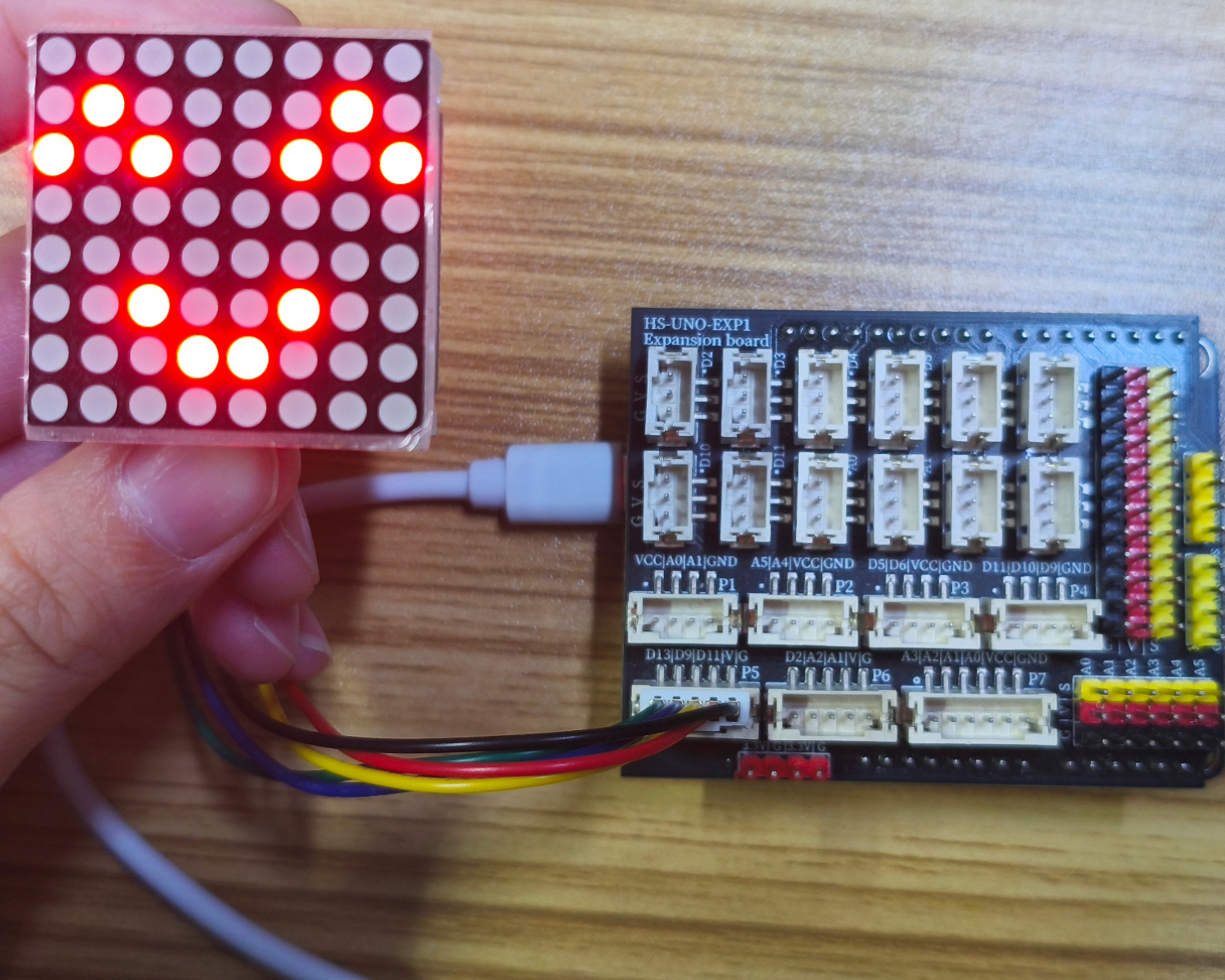 선을 연결한 장치에 대해, 위의 프로그램을 개발 보드에 기록한 후, 리셋 키를 누르면 미소와 우울한 얼굴이 순환으로 표시됩니다。