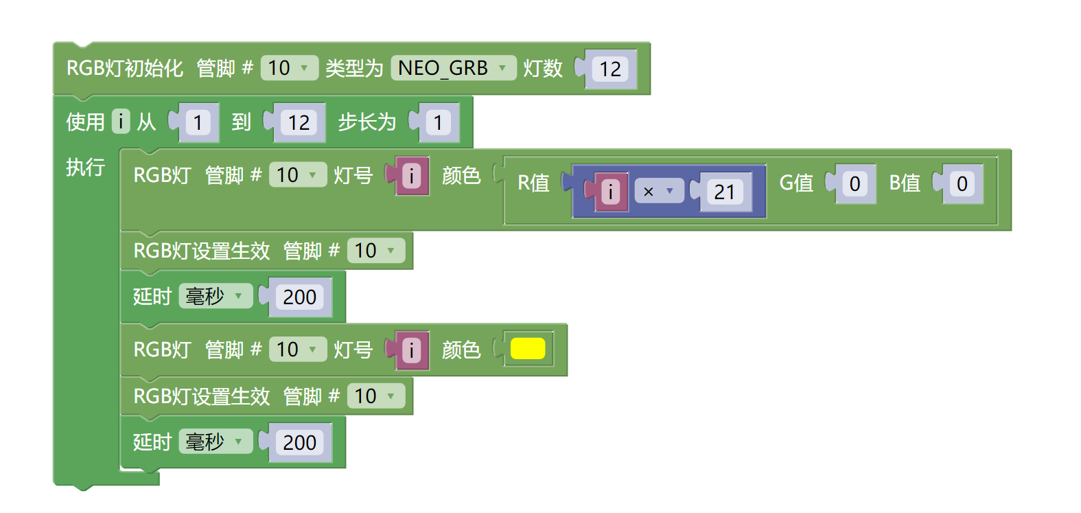 rgb_display_10.setPixelColor((i)-1, ((((i * 21) & 0xffffff) << 16) | ((0 & 0xffffff) << 8) | 0));