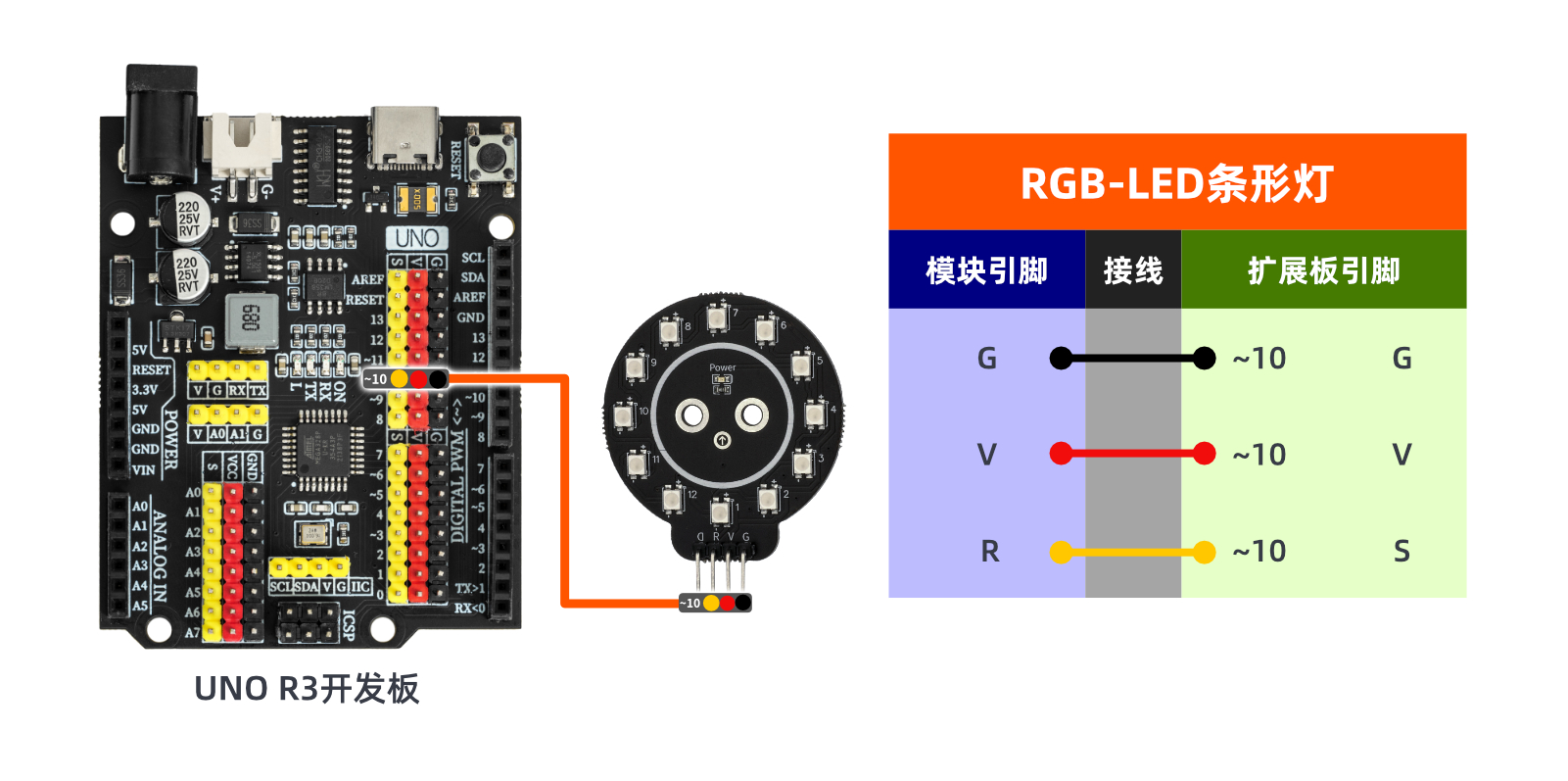 R(RGB) | 신호 입력을 통해 RGB LED 색상과 연결 개수를 제어하는 데 사용됩니다. |