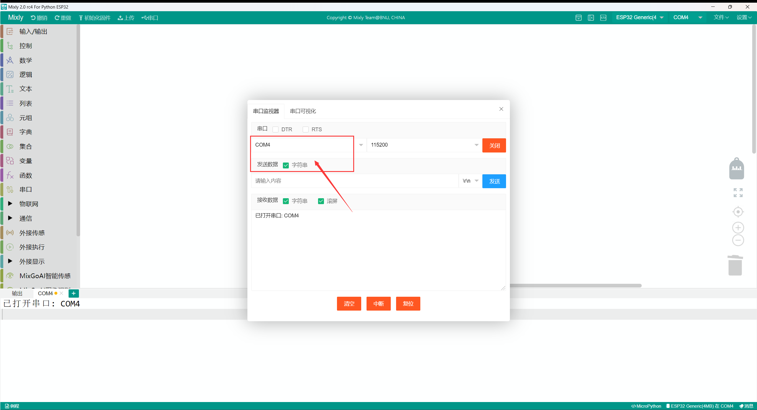 选择正确硬件和端口(选择ESP32 Gemeric(4MB)和com口)。如果端口是 COM3 或更多高版本端口(COM1 和 COM2 通常保留用于硬件串行端口)。要找出答案,您可以断开 ESP32开发板的连接并重新连接电脑;消失的com端口就是ESP32开发板com端口。重新连接主板并选择该串行端口。在这里,您应该选择 COM 4,如下所示。