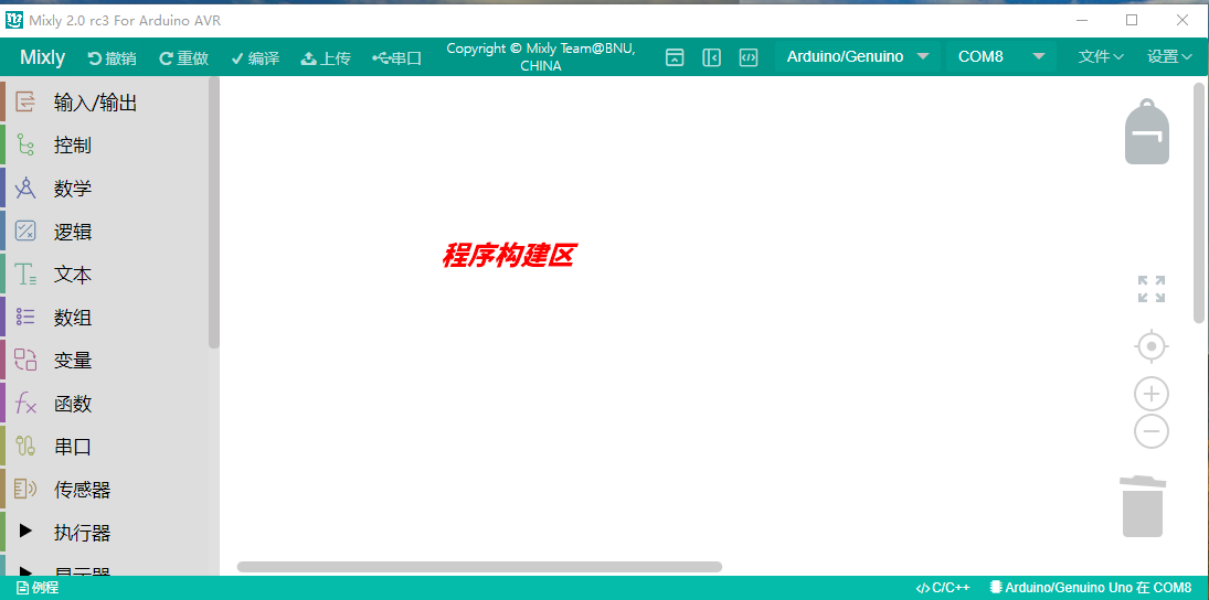 该区域为程序功能拼接区域。将功能块从左侧块区拖入程序建构区进行拼接。该区域的右下角有个垃圾桶,可以将不用的代码拖进去删除,也可以将不用的代码直接往最左方拖拽(模块选择区),同样可以删除代码。当然,点击不用的代码后点击键盘 Delete也可将代码删除,还可以右键点击块选择删除块.