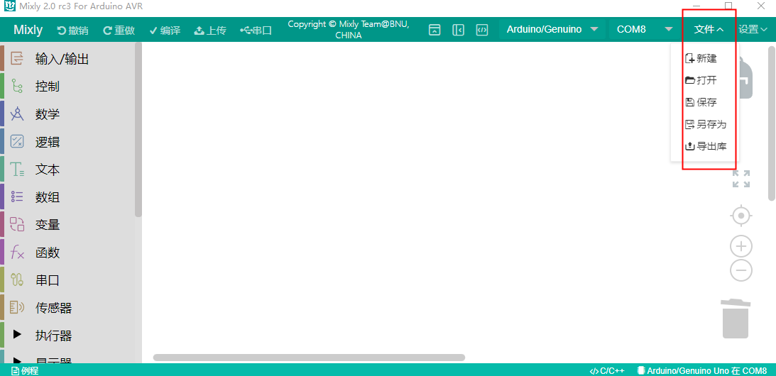 代码程序上传到开发板或者兼容板之前,必须先了解米思齐软件工具栏中出现的每个区和接口的功能。
