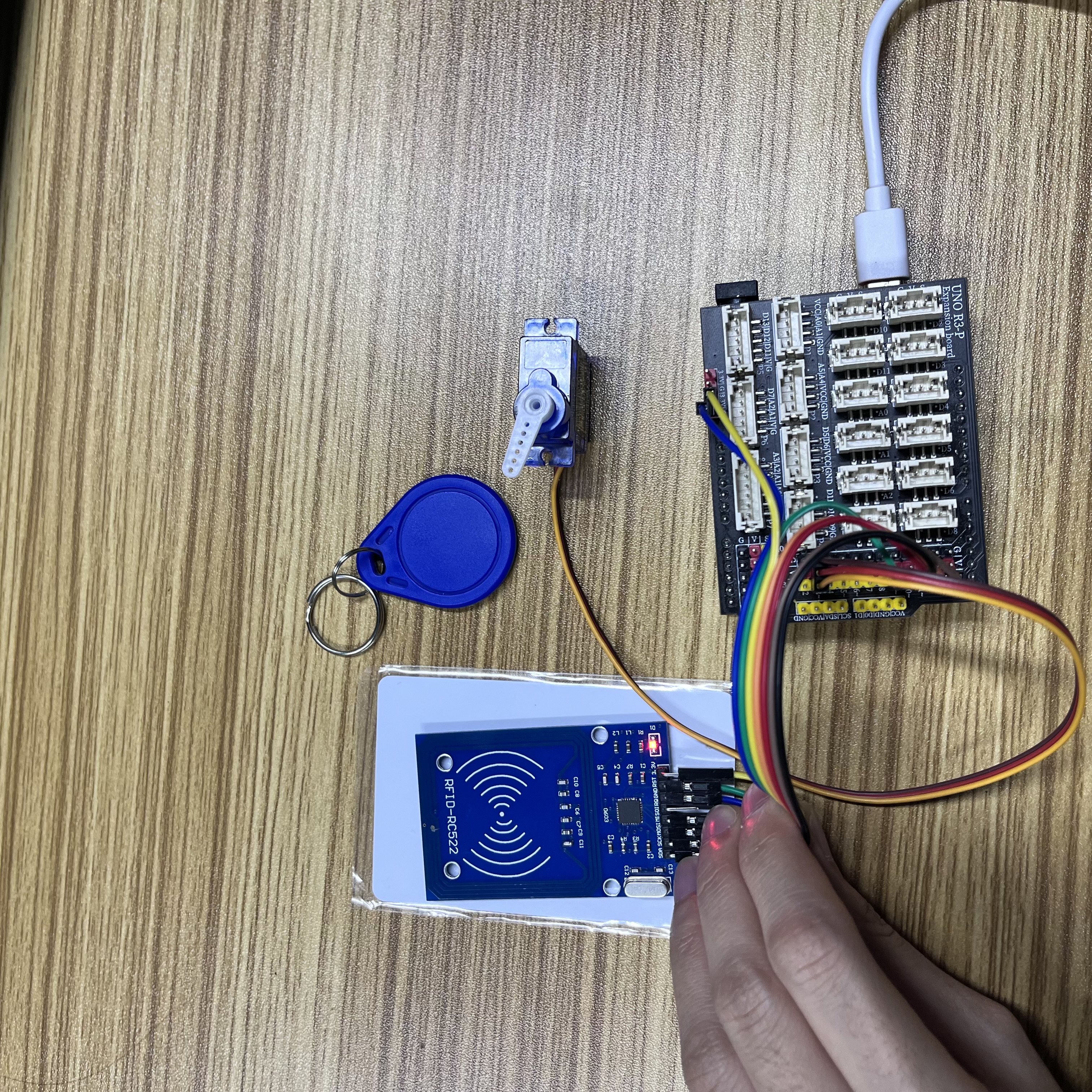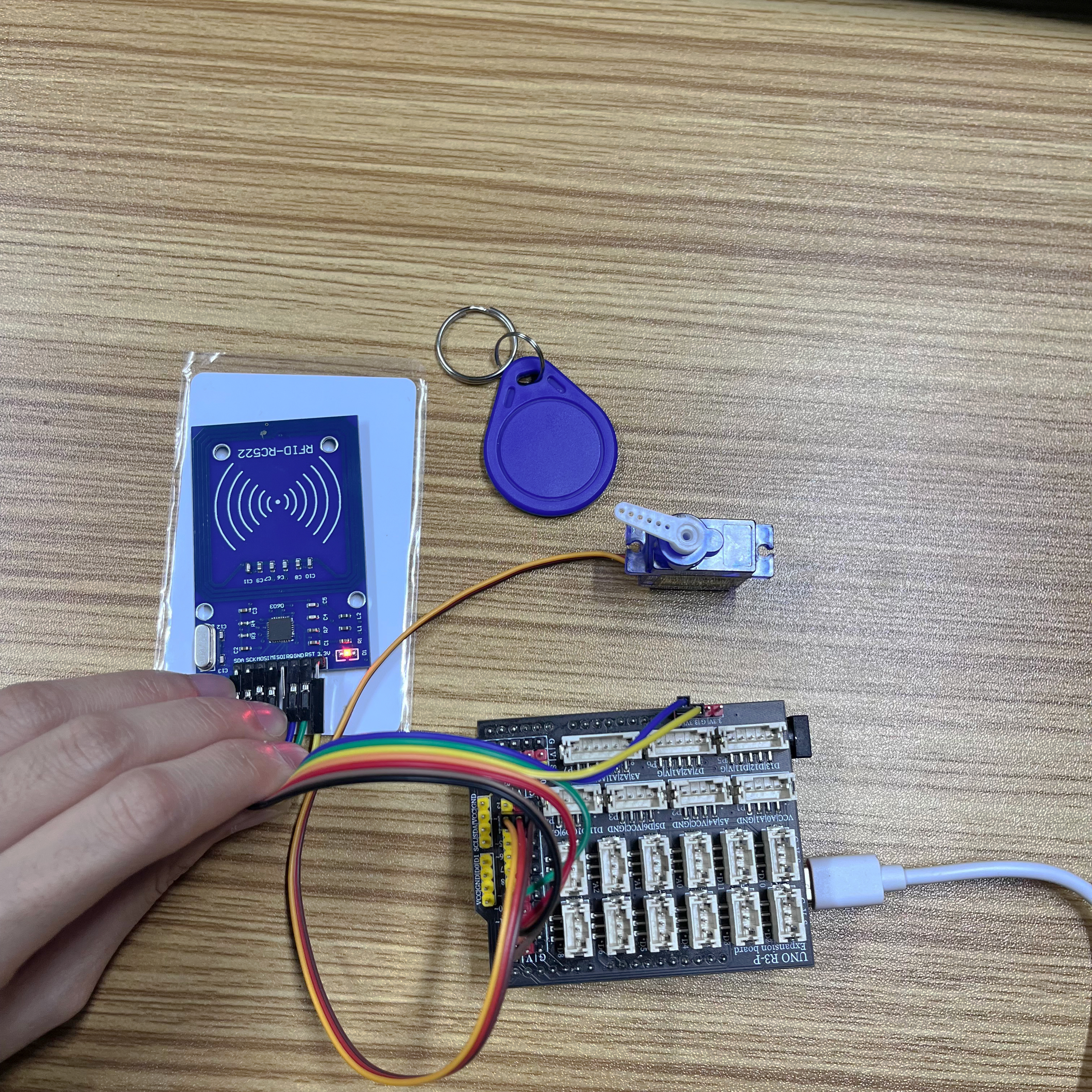 将器件连接好线之后,将上述程序烧录到 Arduino UNO 开发板之后,刷卡后舵机会旋转模拟开门和关门。