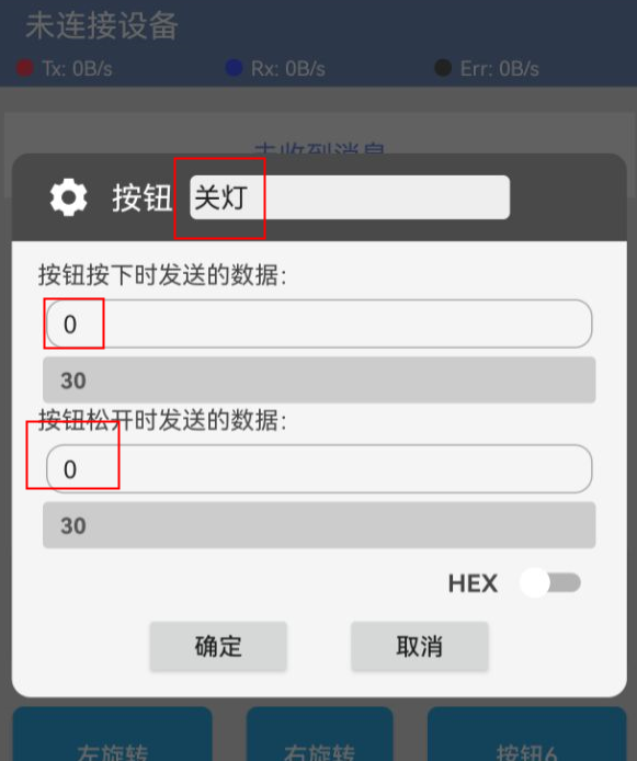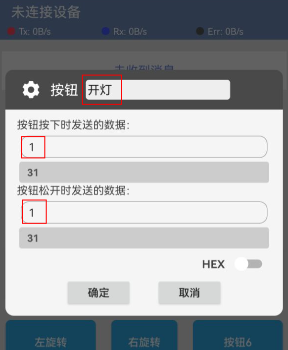 器件连接好线之后,将上述程序上传到 Arduino UNO 开发板之后,先打开手机app软件,然后连接蓝牙,进入编辑模式设置两个按键发送的数据然后再退出编辑模式。当Arduino uno接收到数据“1”时,LED 灯亮起,当接收到数据“0”时,LED 灯熄灭。我们也进入对话模式发送数据“1”或者发送数据“0”控制led亮灭。