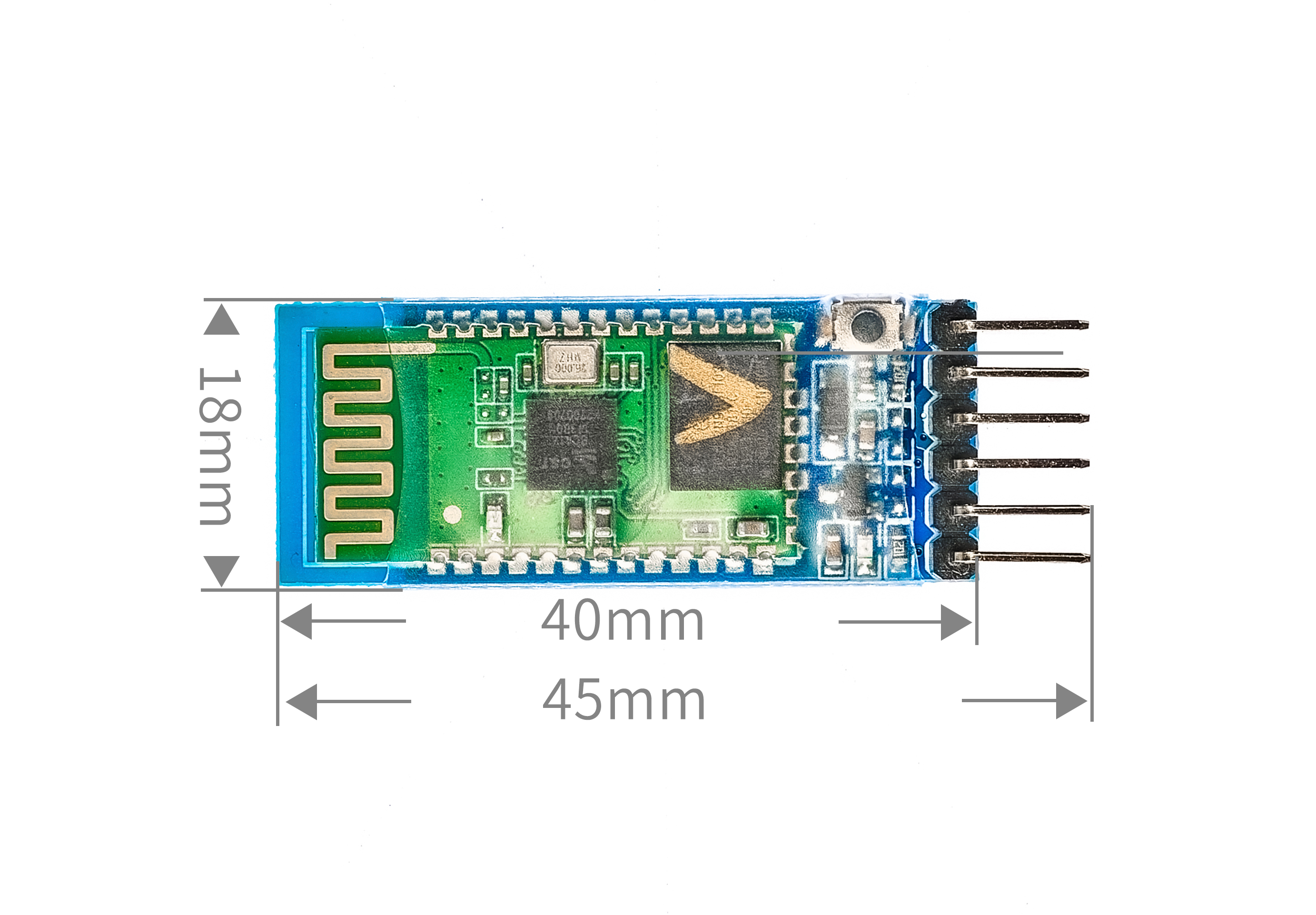 核心模块使用HC-05从模块,引出接口包括VCC,GND,TXD,RXD,KEY引脚、蓝牙连接状态引出脚(STATE),未连接输出低,连接后输出高。