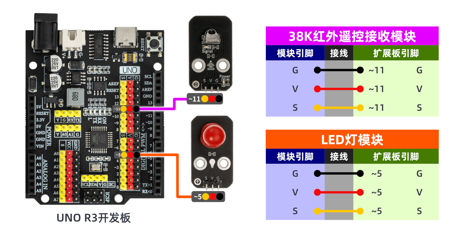 器件连接好线之后,将上述程序烧录到Arduino UNO 开发板之后,再将红外信号发送实验按照文档描述接线 ,并用另一块Arduino UNO 开发板烧录红外接收程序,上电就可以看到发射和接收的效果。