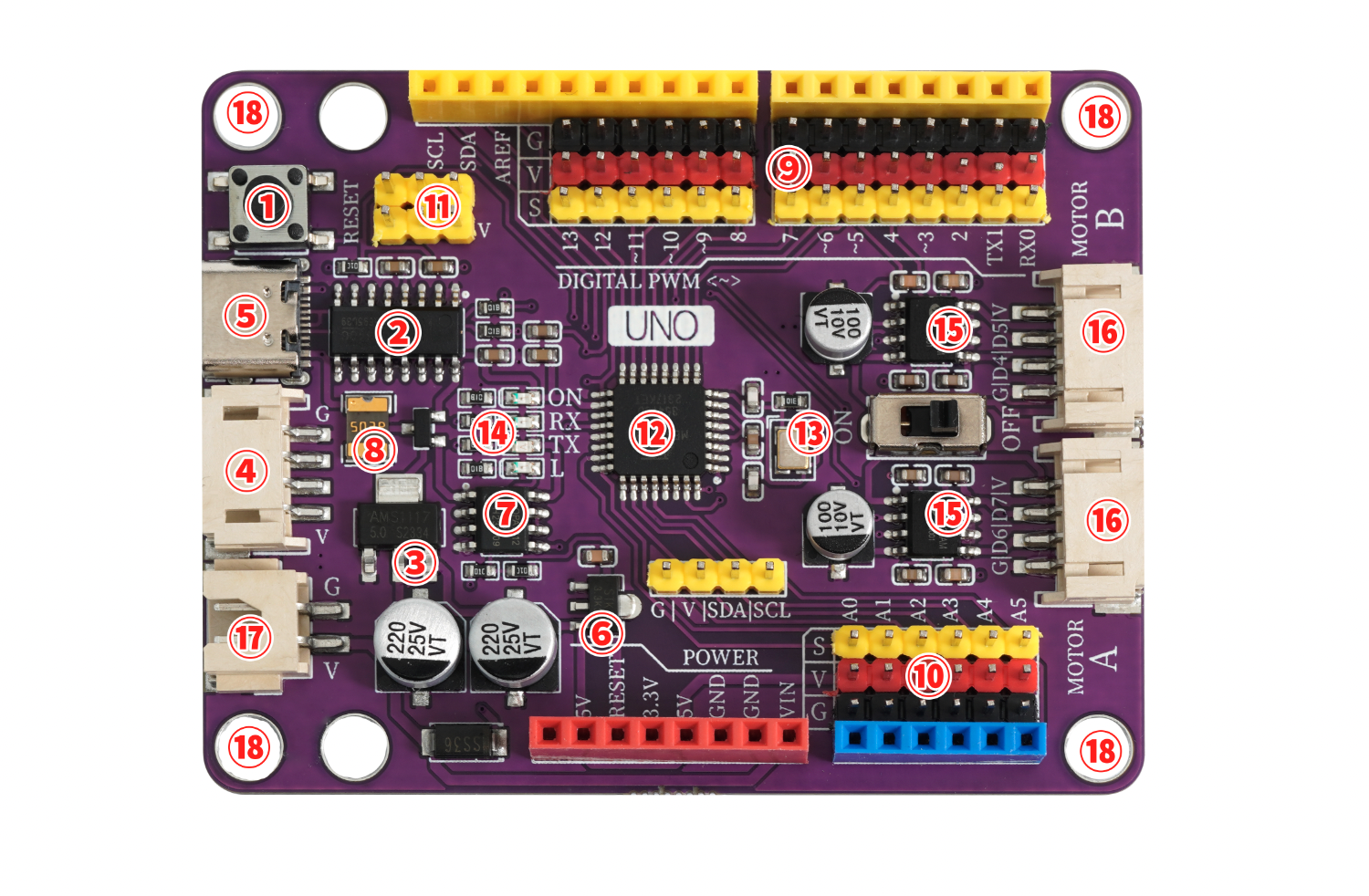ATMEGA328P主控晶片是開發板的大腦,負責程式儲存、執行、運算處理、信號輸入輸出等功能。⑬晶振