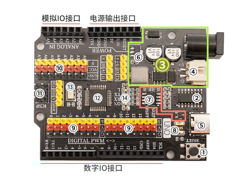 ATMEGA328P主控晶片是開發板的大腦,負責程式儲存、執行、運算處理、信號輸入輸出等功能。⑬晶振
