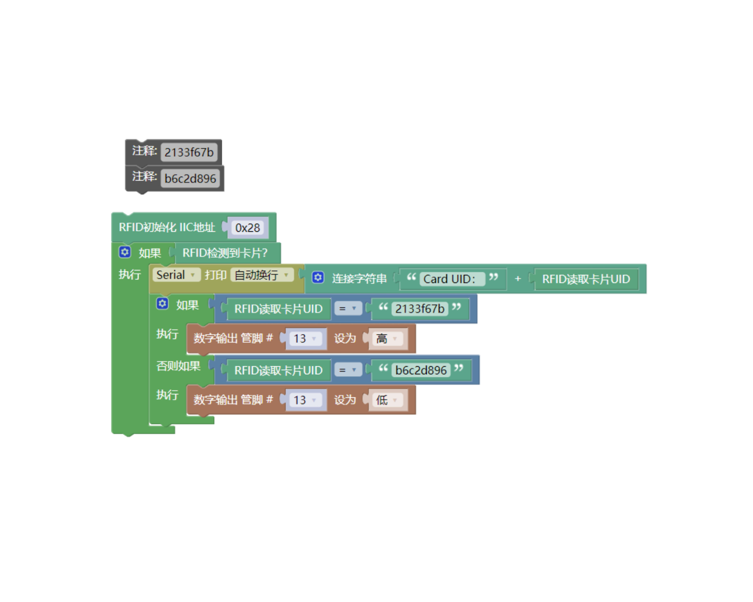if (mfrc522.Read_Uid() == "2133f67b") {