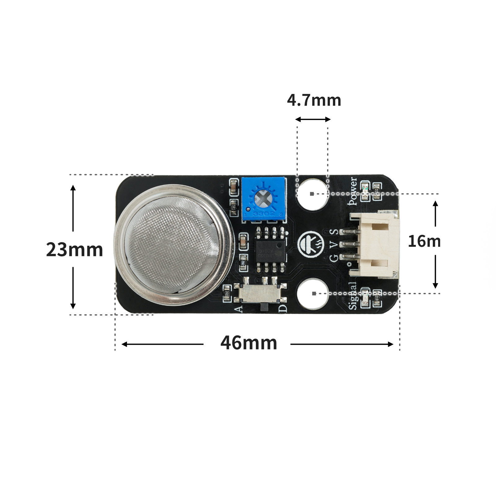 調節模組背面電位器的閾值,在氣體傳感器模組通電的的情況下,用小螺絲刀調節傳感器模組的電位器,調至在沒有氣體或者煙霧干擾的的情況下,傳感器信號指示藍燈熄滅,有氣體或者煙霧情況下氣體傳感器模組信號指示藍燈亮起。