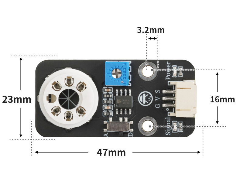 7、模組上設有AD數字模擬切換開關,開關撥到A時輸出模擬值,撥到D時輸出數字信號,觸發閾值由模組上的可調電位器控制。