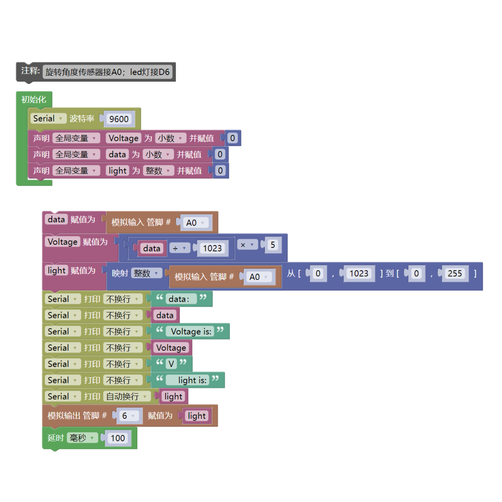 //旋转角度传感器接A0;led灯接D6