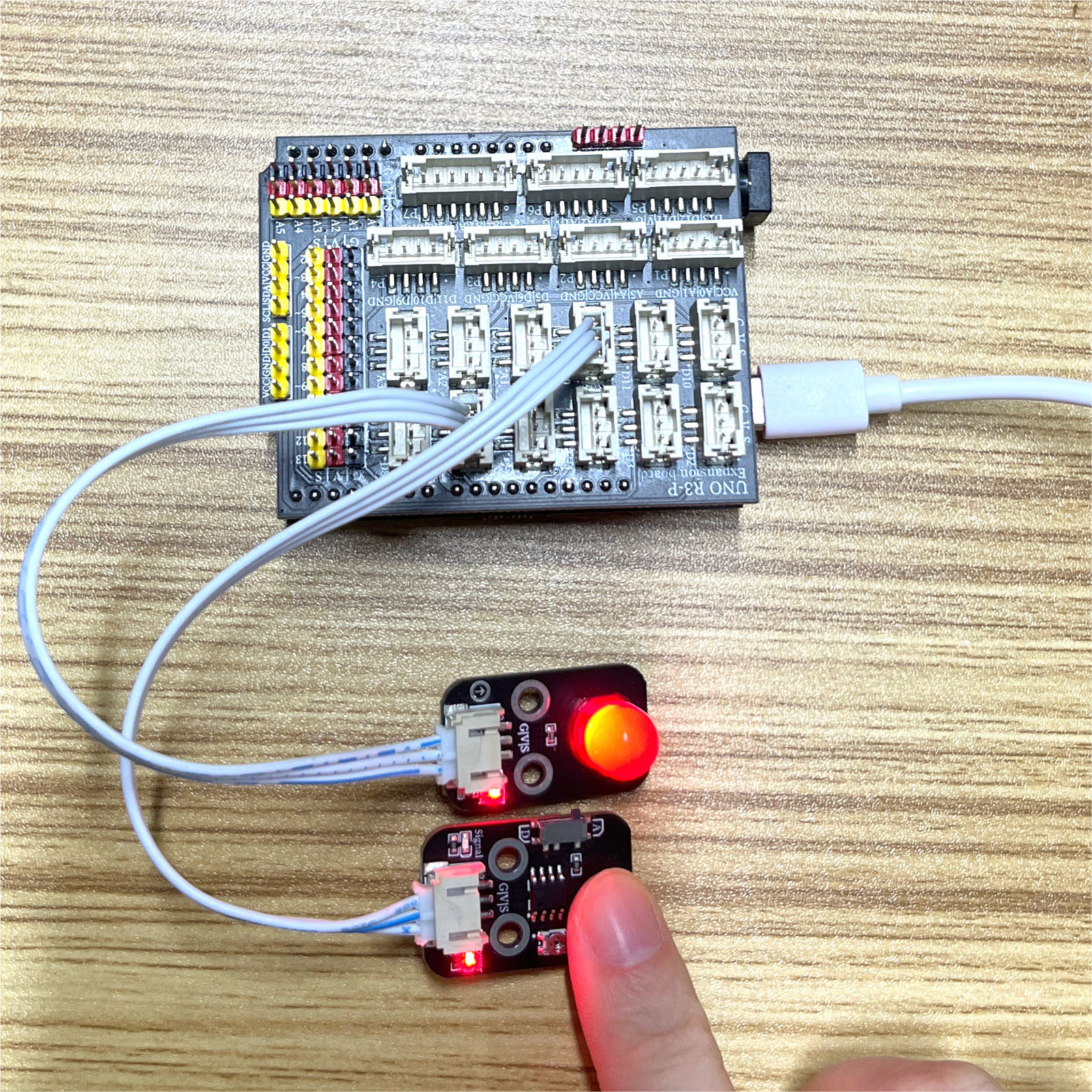 //当手遮住光敏传感器时,显示数值将变小,led灯变亮;当光线变强时,显示数值将变大,led灯变暗;
