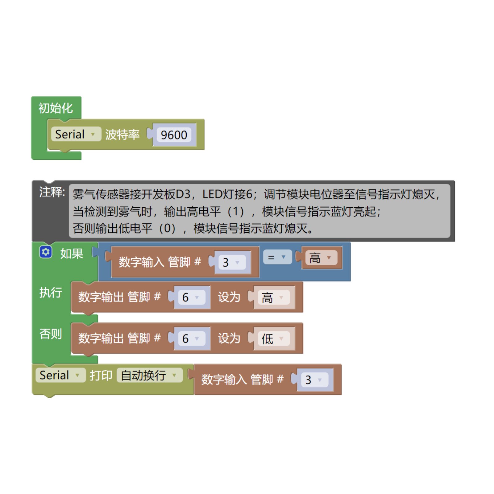 //雾气传感器接开发板D3,LED灯接6;调节模块电位器至信号指示灯熄灭,