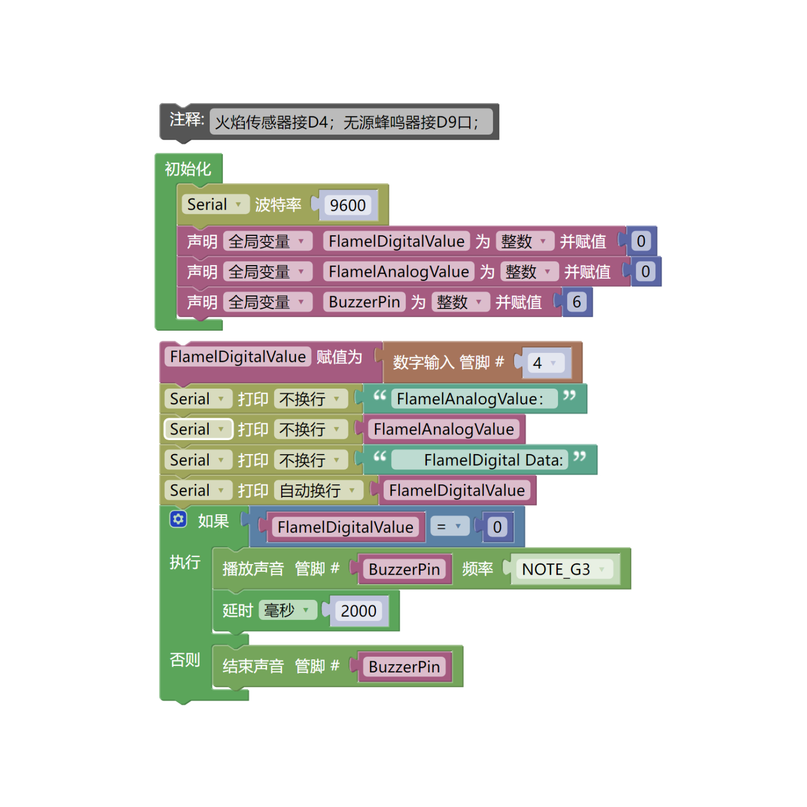 //火焰传感器s引脚接D4,火焰传感器A接A0(如需要检测火焰传感器模拟值);无源蜂鸣器接D6口;