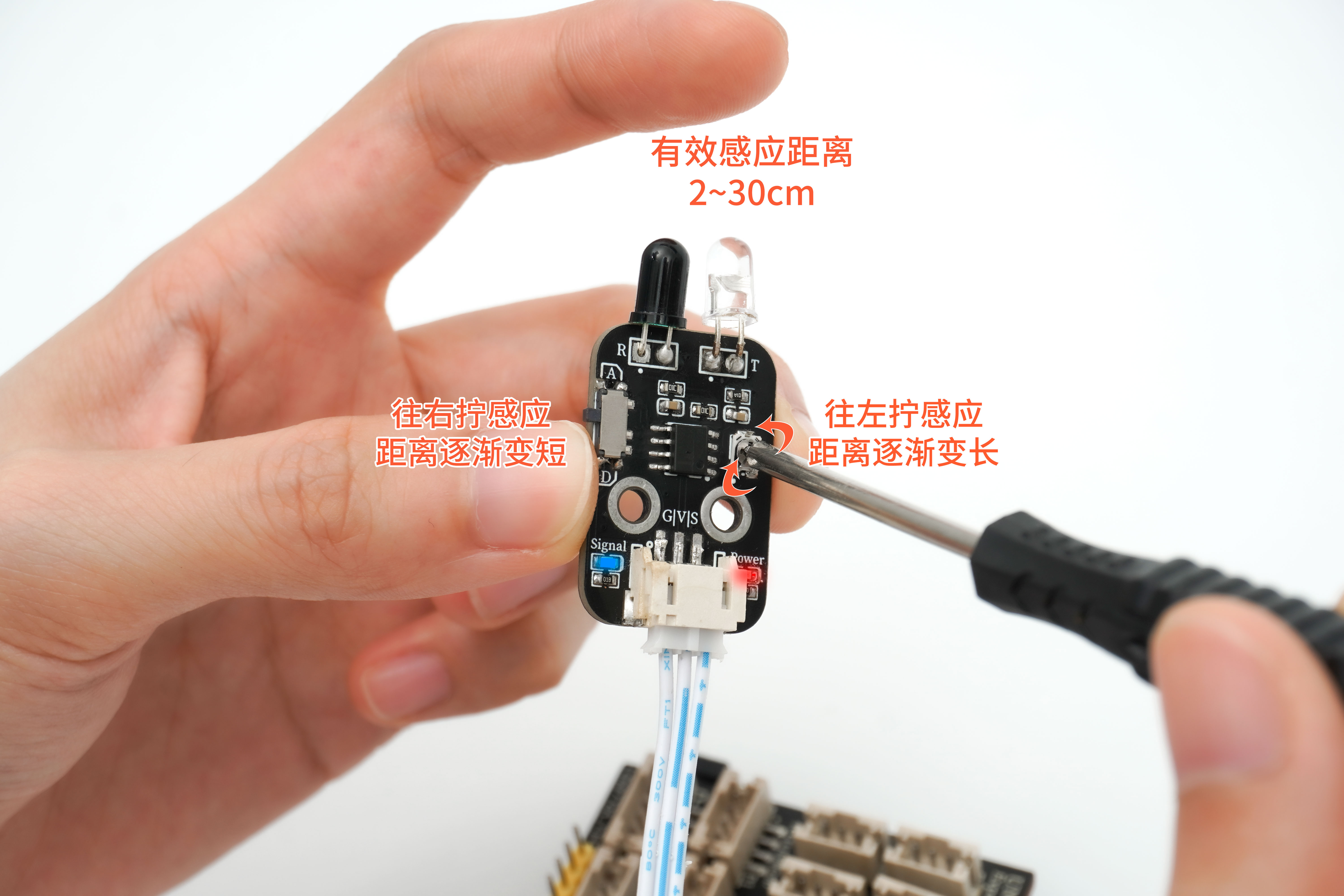 模組調試:在紅外避障模組通电的狀況下,用小螺丝釘調節紅外避障模組的電位器,使手指離紅外避障探头20mm左右,感應器信號指示藍燈亮,手指離探头20mm外紅外避障模組信號指示藍燈滅。注意: 紅外避障模組的紅外發射和接收探头對受環境光干擾較大,請不要在陽光太強的環境下調試。