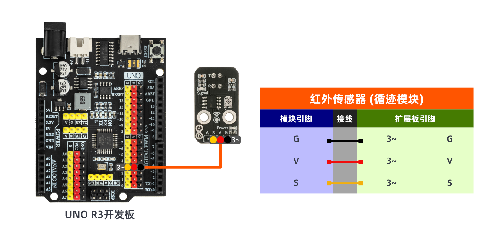 紅外探測(循跡)模組的紅外發射和接收頭受環境光干擾較大,一 般來說,越靠近反射面,效果越好。紅外探測(循跡)模組背面有一個電位器,通過調節電位器,可以調節模組的閾值,實現對應數字信號的輸出。調節電位器的電壓可以調節紅外線传感器的探測距離。當調節到LED藍燈剛好熄滅時,檢測距離最遠。如果LED藍燈常亮或者一直不亮可以調節電位器。使LED藍燈處於剛好熄滅的狀態。工作電壓:3.3~5V。檢測反應距離:1~50mm。