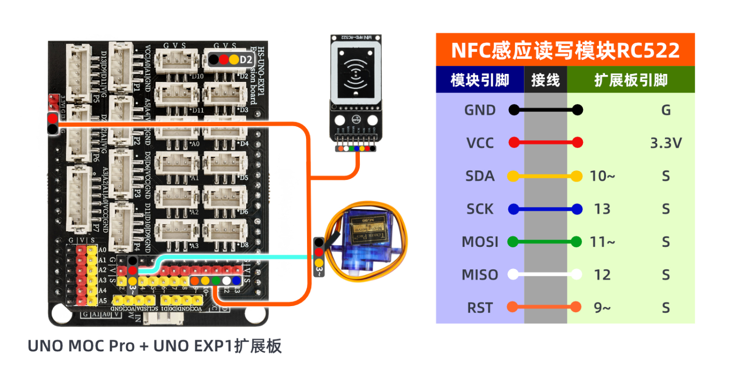 將器件連接好線之後,上傳程式到Arduino UNO 開發板之後,刷卡後舵機會旋轉使積木上下擺動模擬開門、關門。