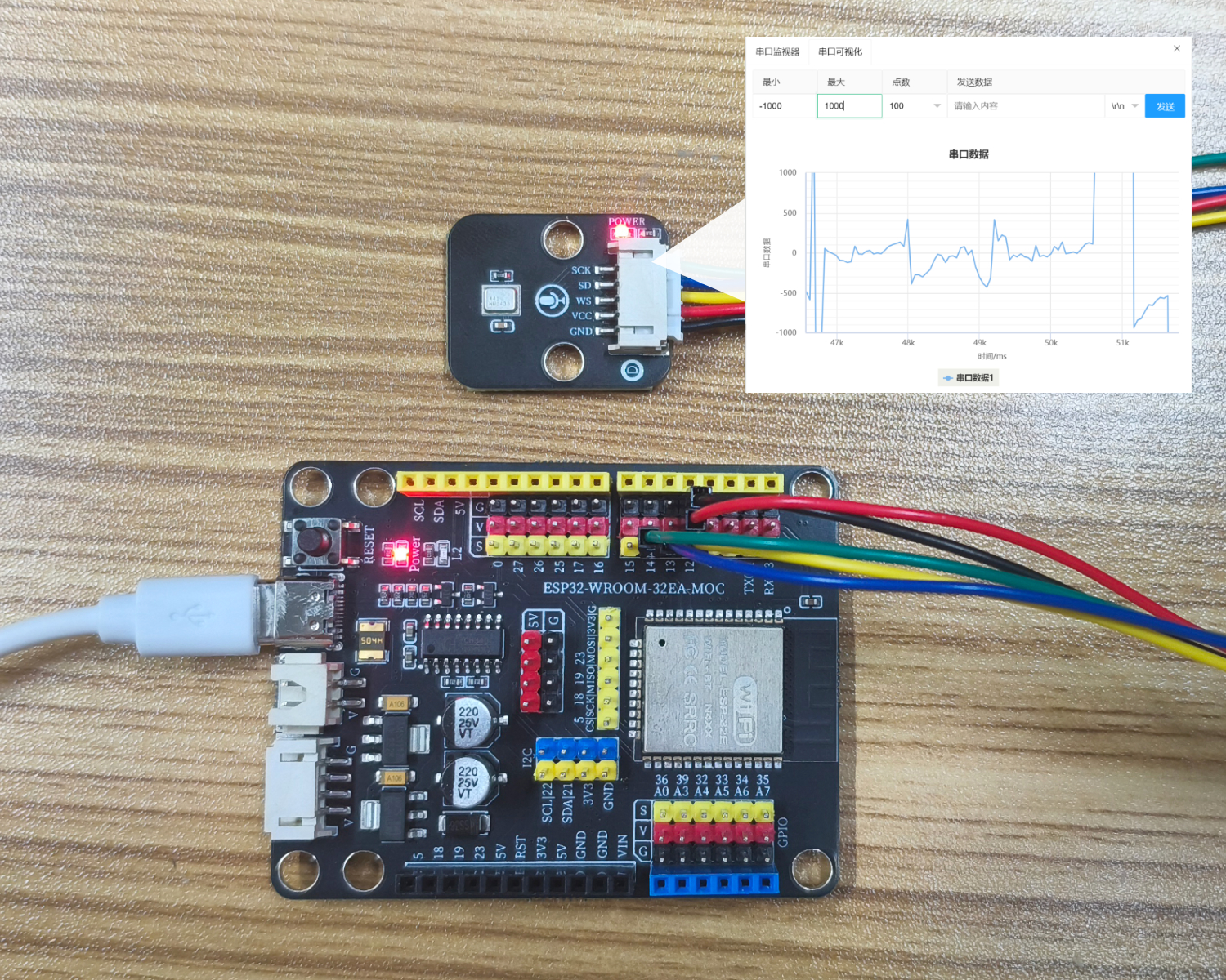 把串口視覺化參數改為最小-1000,最大1000,點數100,對準麥克風說話,在串口視覺化的圖表中,能看到反映聲音變化的波型數據。.