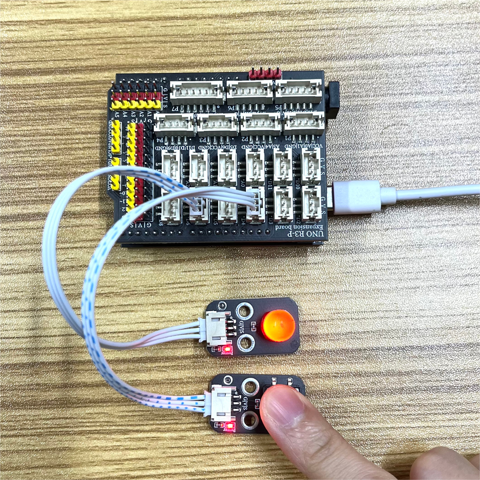 器件連接好線之後,將上述程式燒錄到開發板之後,按下按鍵將使得 LED 輝亮,放開則燈滅。透過按鈕的按下與放開,觸發按鈕的信号口輸出高低電平,通過判斷信号口的高低電平狀態,控制 LED燈的亮與滅的狀態。