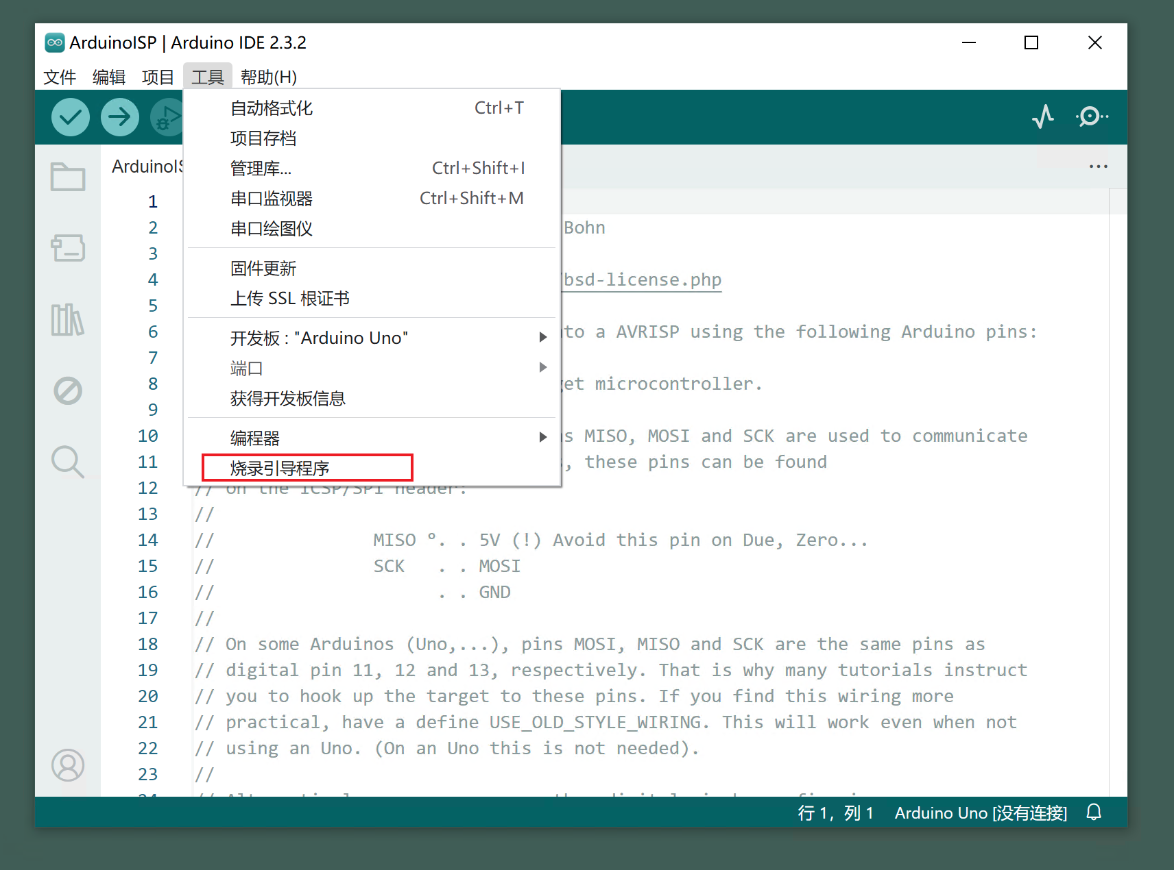 在菜單欄中找到 文件 -> 示例 -> 11.ArduinoISP -> ArduinoISP 並打開