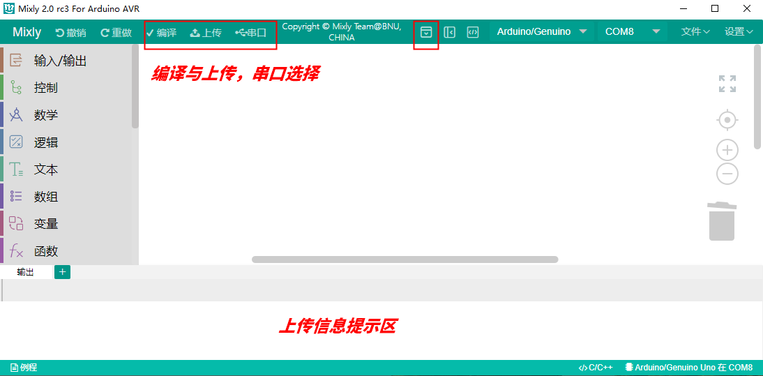代碼程序上傳到Arduino開發板或者相容板之前,必須先了解米思齊軟體工具欄中出現的每個區和接口的功能。
