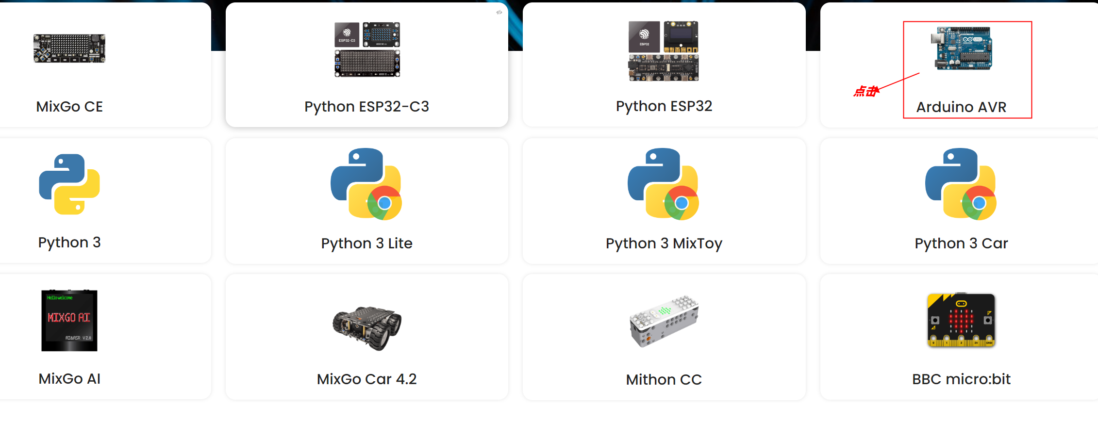 點擊電腦桌面上 的mixly圖標來打開軟體,選擇Arduino AVR