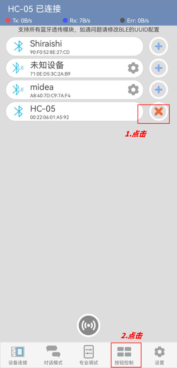 可以在APP市場裡搜尋藍牙串口助手,一般第三方的都可以用,如果自己找不到的,我們在官網放了1個APK(1_base)的軟體(藍牙調試器)下載連結,可以自己導入到手機後安裝。先打開軟體,然後連接藍牙。
