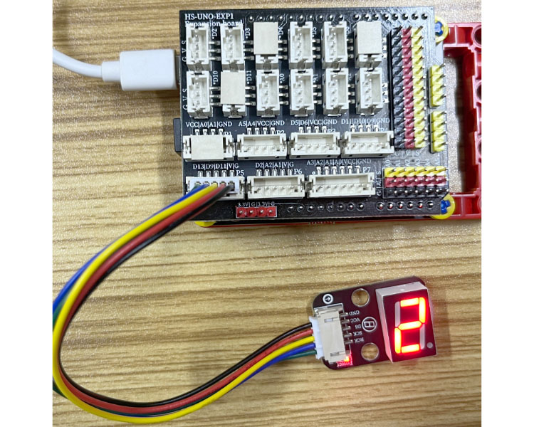 器件連接好線之後,將上述程序燒錄到UNO-R3 PRO開發板之後,接通電源。之後可以觀察到數碼管開始計數。