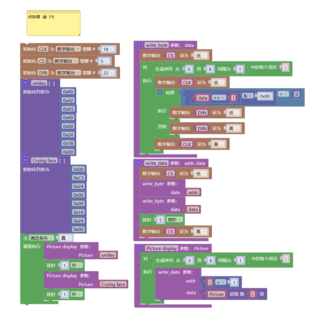 器件連接好線之後,將上述程序燒錄到 開發板之後,按下复位鍵,會看到點陣循環顯示笑臉和哭臉。