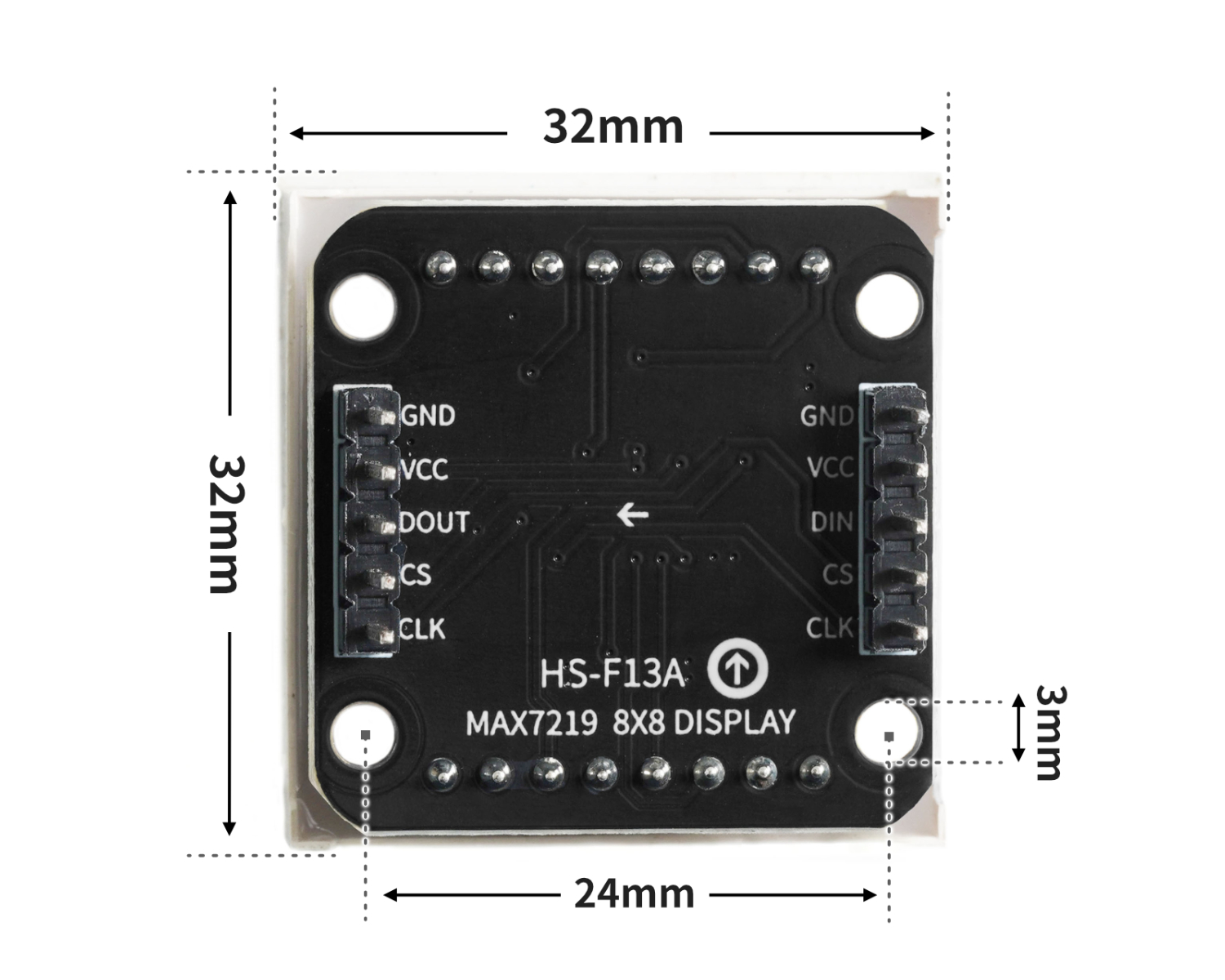 8*8 點陣模組由 MAX7219 驅動,MAX7219 是一種集成化的串行輸入/輸出顯示驅動器, 只需要 3 個 IO 口即可驅動 1 個點陣,點陣顯示時無閃爍且支持級聯,8*8 點陣模組通過 Max7219 驅動,Max7219 運用的是三線串行通信,當接收 Arduino 資料時通過晶片內部 8*8 位靜態 RAM 儲存資料,在通過 Max7219 來控制 8*8 點陣模組的每個引腳的高低電平,從而達到顯示目的。