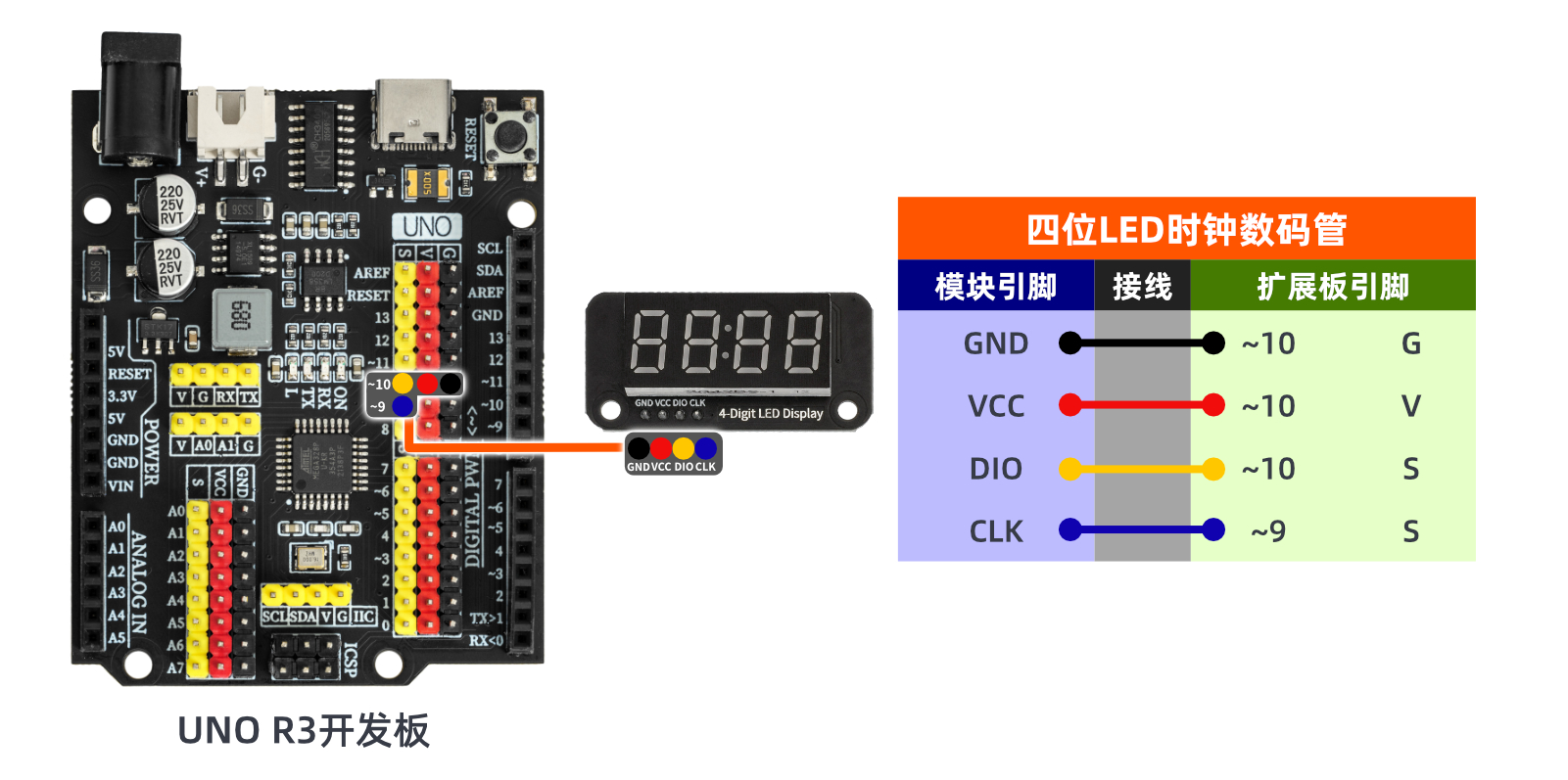 4位7段數碼管由一個12管腳的4位7段共陽極數碼管和一個控制晶片TM1637構成。另一邊是數碼管的圖標標誌。此產品可以應用在時間顯示,跑步顯示以及其他需要顯示數字的設備上。