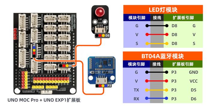 //蓝牙模块G,V分别接扩展板G,V;led模块D4