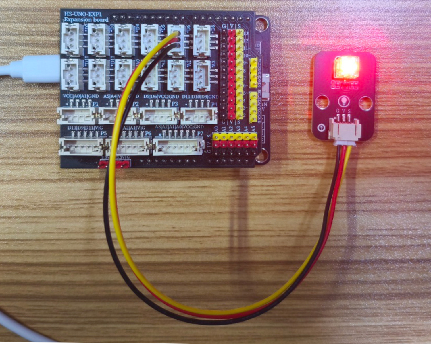器件连接好线之后,将上述程序上传到 UNO R3 PRO 开发板之后,将会发现 LED 灯会以亮 1 秒灭1秒的频率闪烁,达到了我们想要的效果。