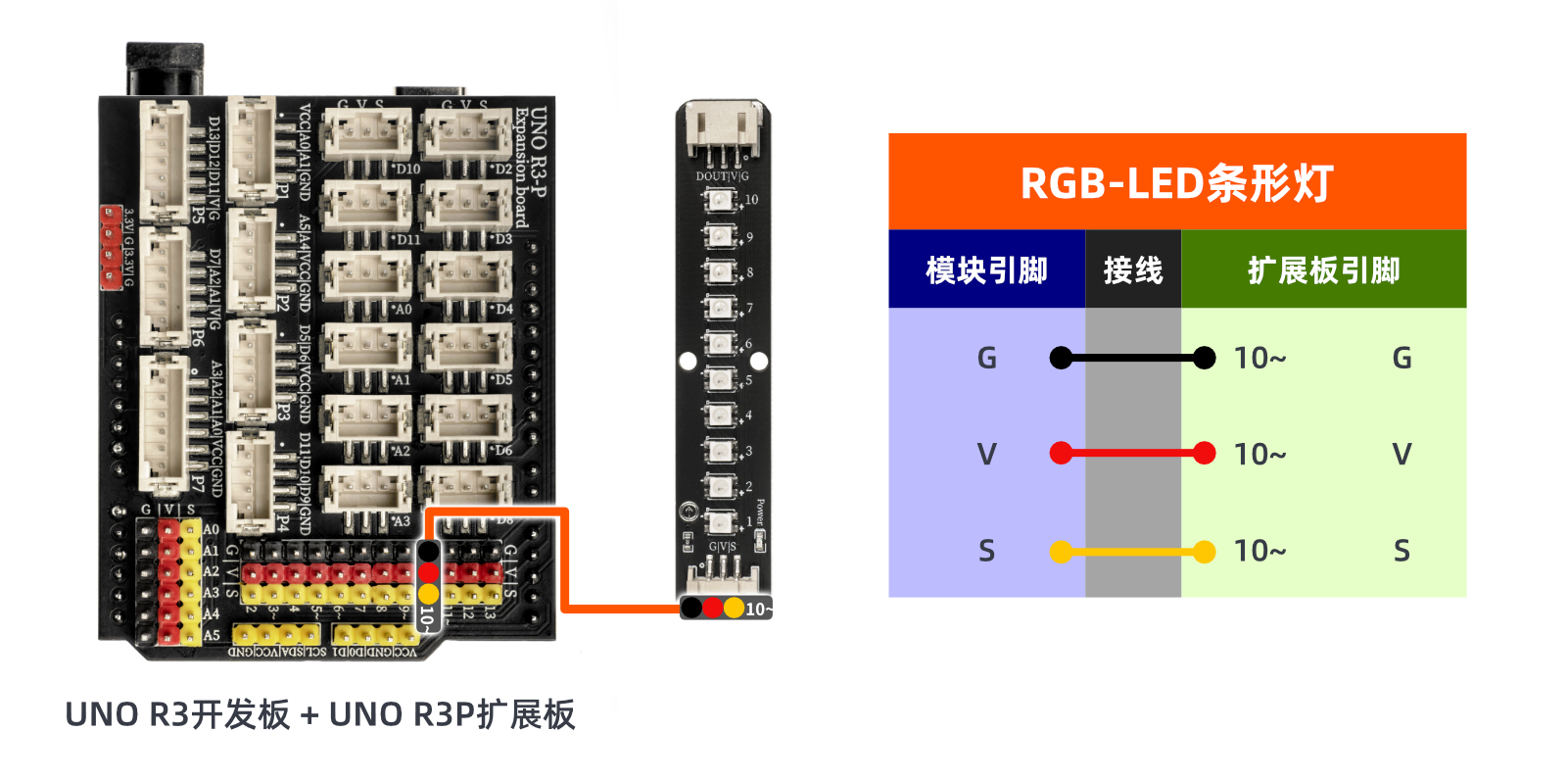 RGB-LED条形灯是一种可变色彩的LED照明设备,它由多个RGB LED组成,并排安装在灯条上形成一条线性排列。RGB代表Red(红色)、Green(绿色)和Blue(蓝色),这些LED可以独立或同时发光,通过不同的亮度和颜色混合,创造出各种不同的色彩效果,10 位 RGB 条形灯采用 10 颗 WS2812RGB 灯珠串联组成只需要一个 IO 口就可以驱动此模块。WS2812 RGB 灯内部集成了一个芯片我们只需单 IO 口就可以控制WS2812RGB 灯, D 脚为信号输出可以串连下个灯珠。