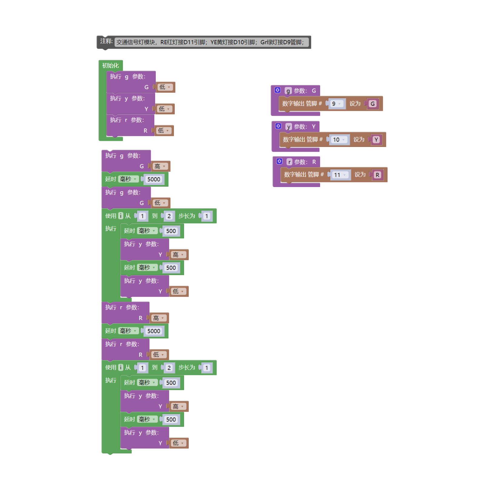 //交通信号灯模块,RE红灯接D11号引脚;YE黄灯接D10号引脚;Gr绿灯接D9号管脚;
