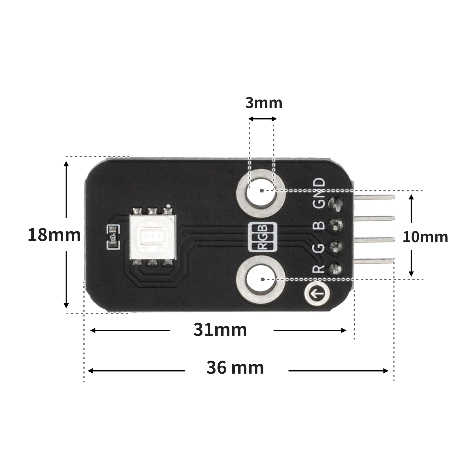 LED是发光二极管的缩写,由混合化合物制成,即镓(Ga),砷(AS),磷(P)。 磷化镓二极管发红光,磷化镓二极管发绿光,碳化硅二极管发黄光。发光二极管的反向击穿电压为5v。 其正伏安特性曲线太陡,模块上板载了限流电阻,以便在使用时控制流过管道的电流。RGB代表红色,绿色和蓝色通道,是行业颜色标准。RGB通过改变三个通道并叠加它们来显示各种新颜色,根据统计,它可以创建16777216种不同的颜色。